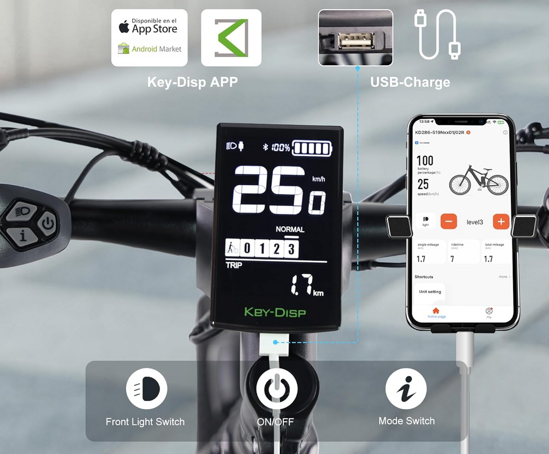 This M27-1 Smart features a smart display with a built-in USB port, functioning as a portable power source for on-the-go charging. Beyond this, the smart system allows you to connect to a dedicated app for route planning, real-time navigation via key-disp App, and vehicle location tracking, ensuring you stay connected and ride with peace of mind
