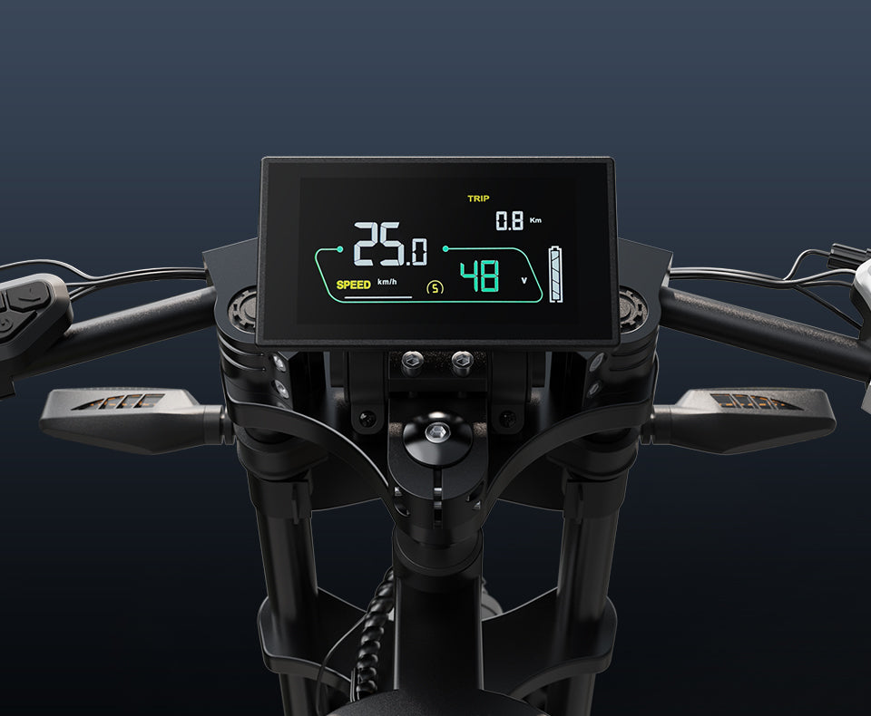 Navigate confidently with the central color LCD display. It presents vital riding data — real-time speed, battery level, total mileage, etc. Designed for high visibility even under bright sunlight, the screen ensures key information is always glanceable and legible.