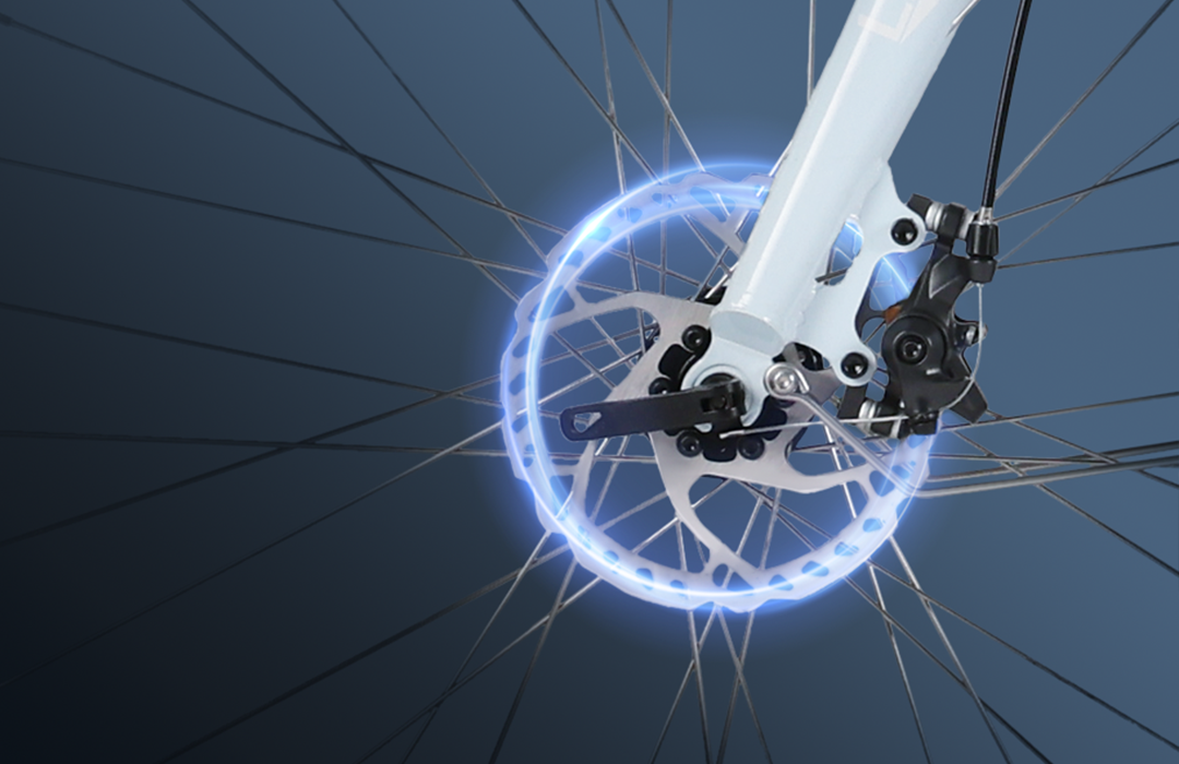 The dual disc brake system featured here delivers exceptional stopping power. Whether you're navigating steep descents or need to make sudden halts in urban riding, these disc brakes ensure precise and reliable braking performance.