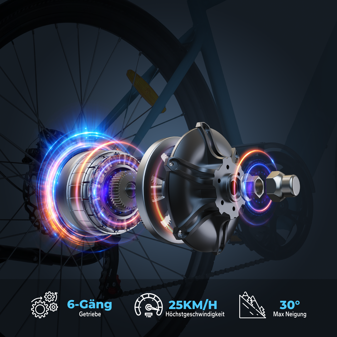 Equipped with a powerful 250W brushless motor, plus 6-speed gearing, 25km/h max speed, and 30° climb