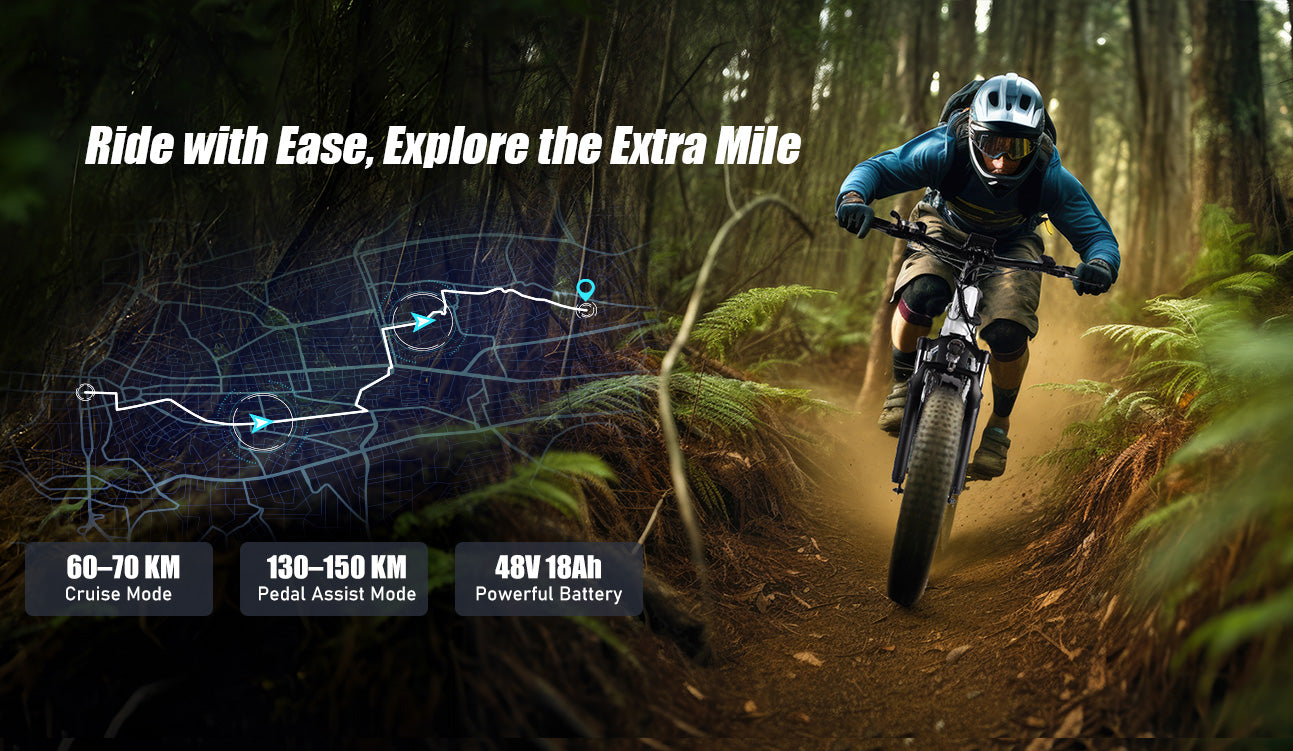Powered by an 864Wh anti-theft battery, it offers the flexibility of easy removal for convenient indoor or outdoor charging. Designed to support long-distance adventures, it delivers an impressive range of up to 150 km (93 miles). For comprehensive security and durability, the battery is safeguarded by a BMS, ensuring operation in harsh freezing conditions.